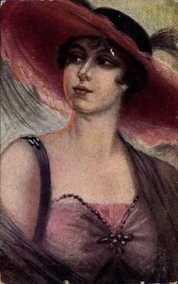 Ak Gemaltes Frau-Porträt, Hut, Kleid