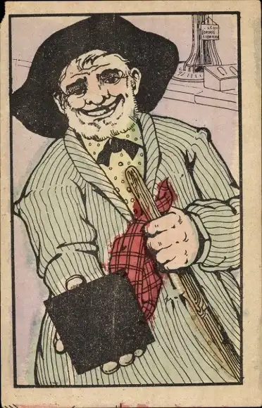 Ak Gemaltes Portrait eines Mannes, Gehstock, Hut, Mantel