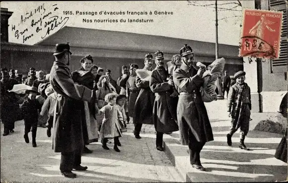 Ak Genève Genf Schweiz, 1915, Passage d'evacues francais, Nos nourrices du landsturm