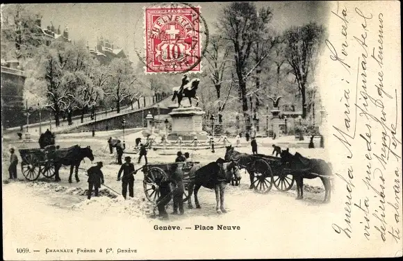 Ak Genève Genf Schweiz, Place Neuve, Kutschen, Schnee