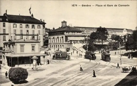 Ak Genève Genf Schweiz, Platz, Bahnhof Cornavin, Straßenbahn