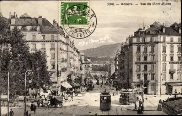 Ak Genève Genf Schweiz, Rue du Mont-Blanc, Hotel Suisse, Straßenbahn, Kutsche