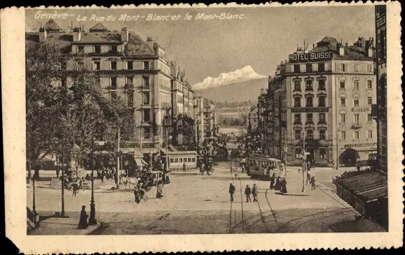 Ak Genève Genf Schweiz, Rue du Mont Blanc et le Mont Blanc, Straßenbahn, Hotel Suisse