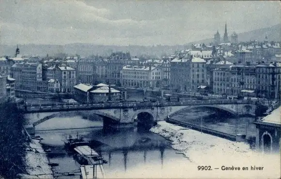 Ak Genève Genf Schweiz, Stadtansicht im Winter, Rhone-Brücke der Coulouvrenière