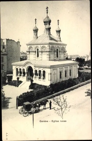 Ak Genève Genf Stadt, Eglise Russe, Straßenpartie mit Blick auf Kirche, Kutsche
