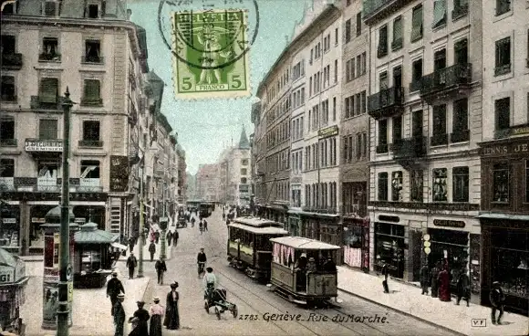 Ak Genève Genf Stadt, Rue du Marché, Straßenbahn