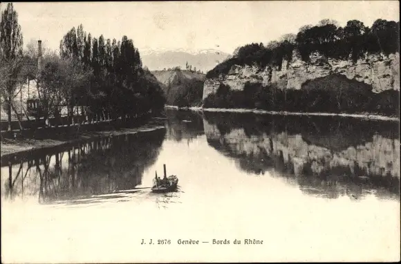 Ak Genève Genf Stadt Schweiz, Bords du Rhone, Flusspartie, Dampfschiff, Gebirge