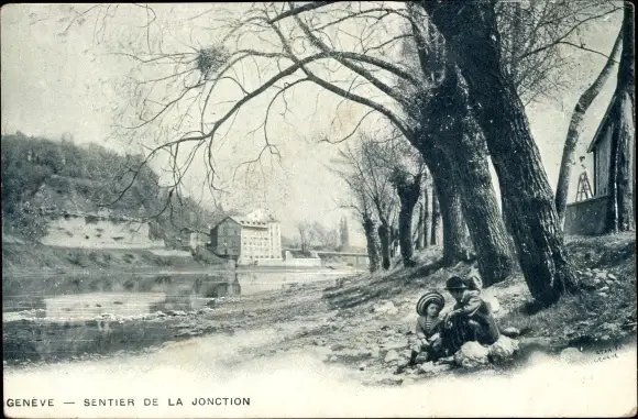 Ak Geneve Genf Stadt, Sentier de la Jonction, Blick zur Stadt, Kinder am Ufer
