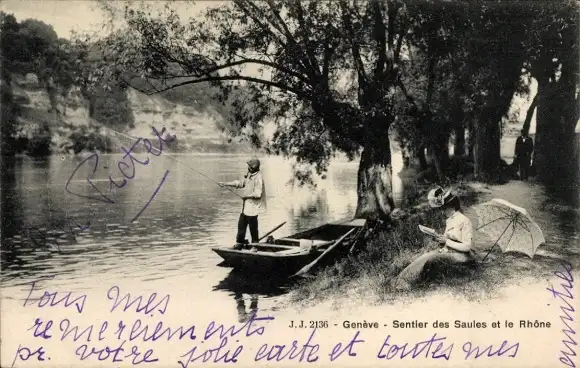 Ak Genève Genf Stadt, Sentier des Saules et le Rhône, Flussufer, Angler