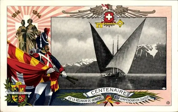Ak Genf Kanton Schweiz, Lac Leman, Schweizer Flagge, Segelboot, Berge, Denkmal, Jahr 1814-1914