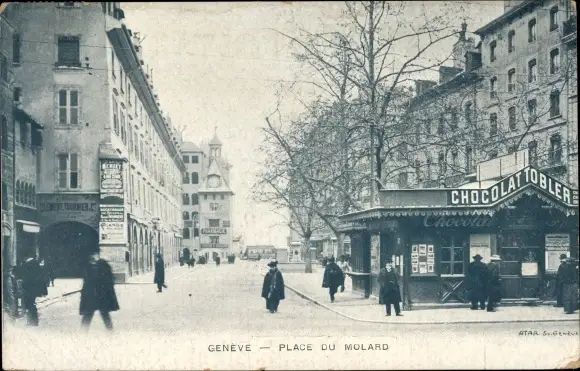 Ak Genf Schweiz, Vue générale de la Place du Molard, Chocolat Tobler
