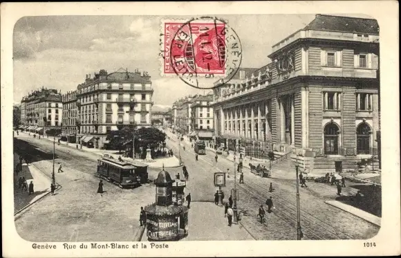 Ak Genf Stadt, Mont-Blanc-Straße, Post, Kiosk, Straßenbahnen
