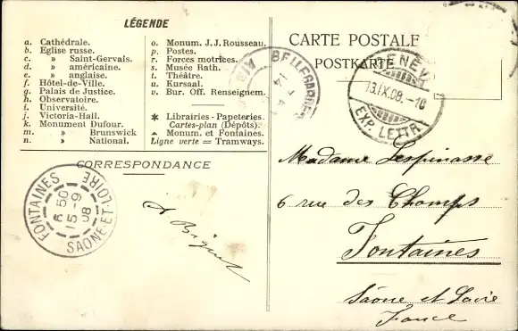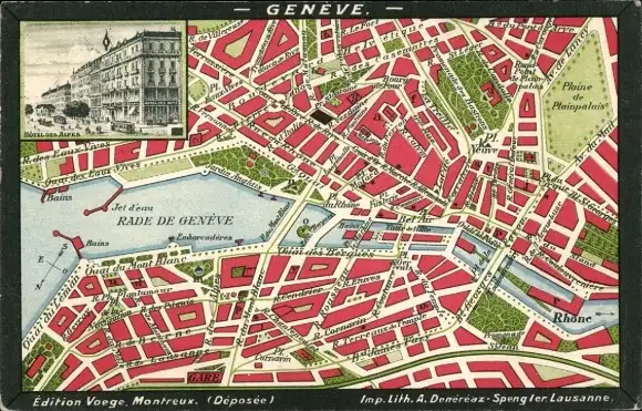 Ak Genf Stadt Schweiz, Karte von Sehenswürdigkeiten, Jet d'eau, Rhone, Palais de Justice