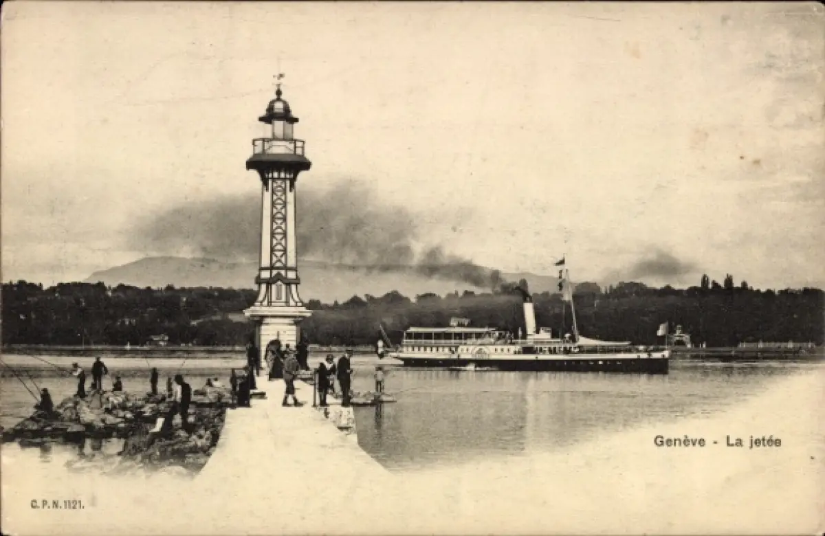 Ak Genf Stadt Schweiz, Leuchtturm, Dampfschiff, Pier, Genfersee, Menschen
