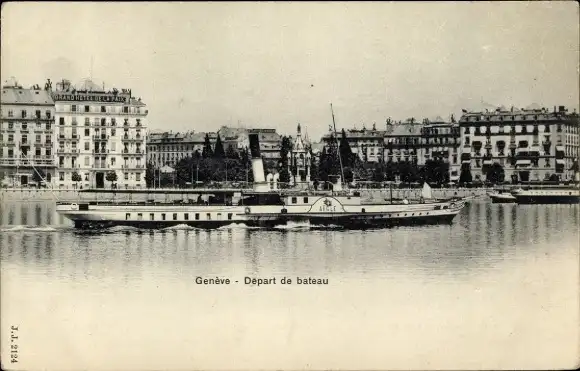 Ak Genf Stadt Schweiz, Schiff auf dem Wasser, Gebäude im Hintergrund, Abfahrt des Schiffes