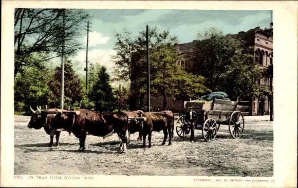 Ak Georgia USA, Ochsengespann mit Baumwollsamen
