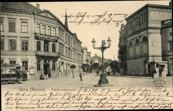 Ak Gera in Thüringen, Adelheidstraße, Photographie-Atelier Franz Scheffer, Straßenbahn, Restaurant