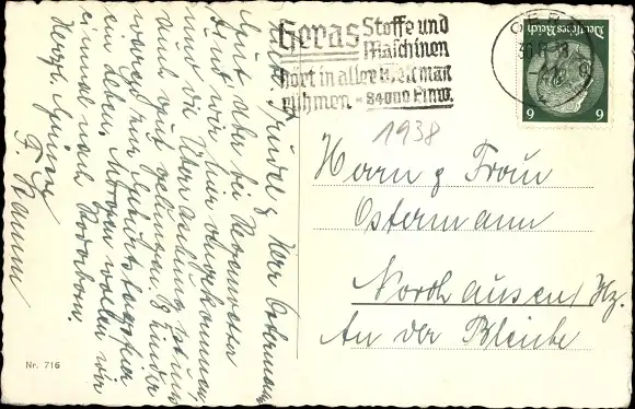 Zustand, siehe Scan, gelaufen, 1938 - ca 14 cm X 9 cm
