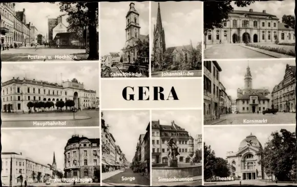 Ak Gera in Thüringen, Johanniskirche, Kornmarkt, Hauptbahnhof, Simsonsbrunnen, Sorge