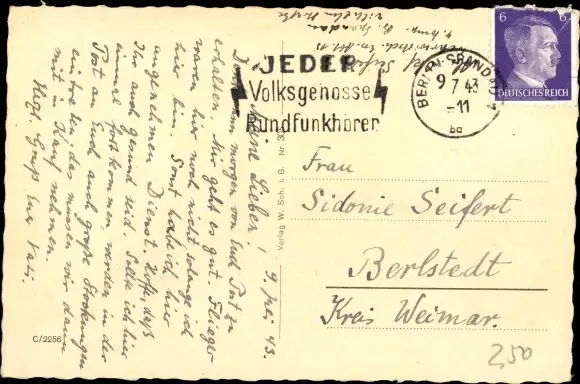 Zustand, siehe Scan, gelaufen, 1943 - ca 14 cm X 9 cm