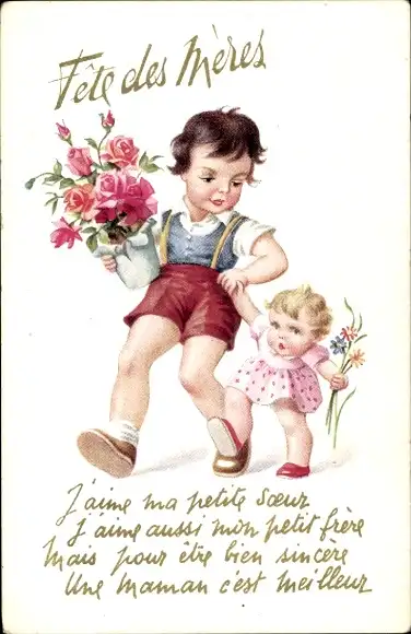 Ak Geschwister, Kinder, Fest, Rosen im Blumentopf