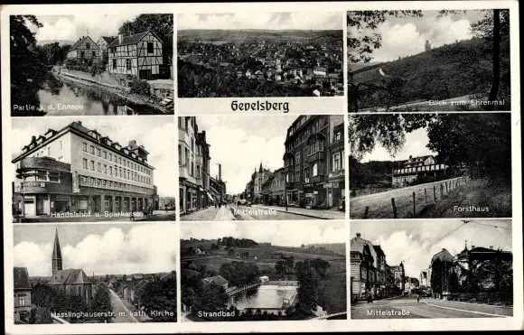 Ak Gevelsberg im Ruhrgebiet, Ehrenmal, Forsthaus, Mittelstraße, Strandbad, Handelshof, Sparkasse