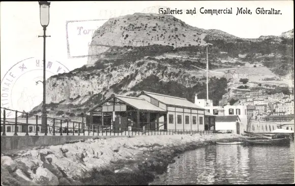 Ak Gibraltar, Galleries and Commerial Mole, Felsen, Boote