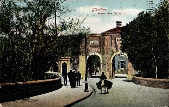 Ak Gibraltar, South Port Gates, Mann auf einem Esel