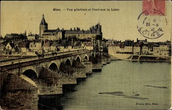 Ak Gien Loiret, Vue generale, Pont sur la Loire