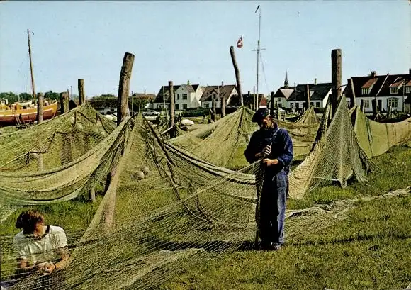 Ak Gilleleje Dänemark, Fischer repariert Netze, Frau hilft