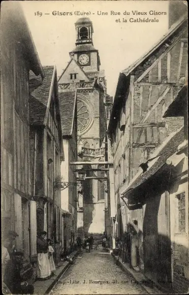 Ak Gisors Eure, Une Rue du Vieux Gisors et la Cathédrale