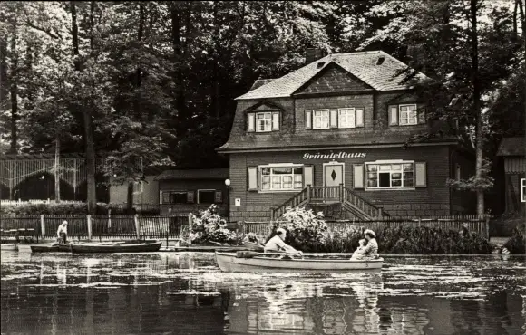 Ak Glauchau in Sachsen, Gründelhaus, Gründelteich, Ruderboot