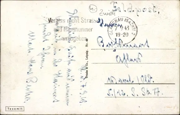 Zustand, siehe Scan, gelaufen, 1943 - ca 14 cm X 9 cm