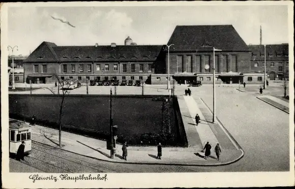 Ak Gliwice Gleiwitz Oberschlesien, Hauptbahnhof, Straßenbahn