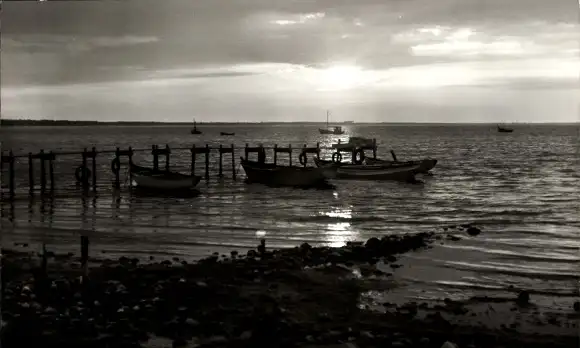 Ak Glowe auf Rügen, Meer, Steg, Boote, Sonnenuntergang