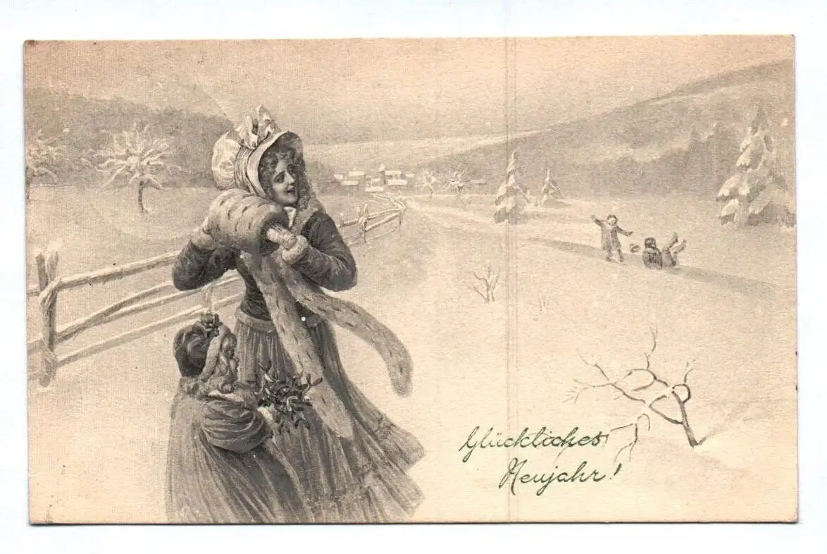 Ak Glückliches Neujahr 1908 Frau mit Kind im Winter