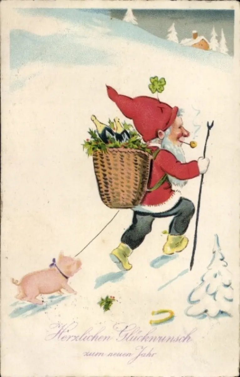 Ak Glückliches neues Jahr, Zwerg mit Schwein, Kiepe