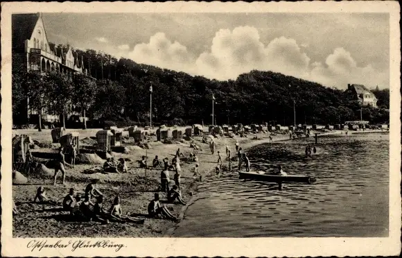 Ak Glücksburg an der Ostsee, Strand, Badegäste, Strandkörbe, Boote