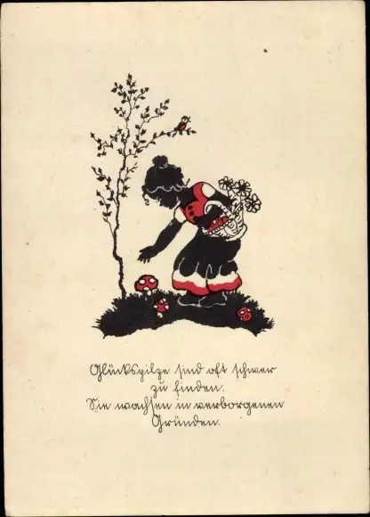 Ak Glückspilze sind oft schwer zu finden, Mädchen sammelt Fliegenpilze