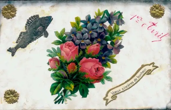 Ak Glückwunsch 1. April, Blumenstrauß, Fisch