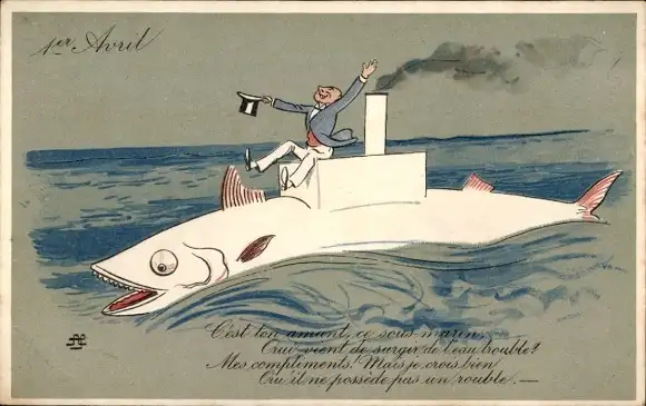 Ak Glückwunsch 1. April, Fisch, Dampfer, Mann mit Zylinder