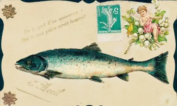 Ak Glückwunsch 1. April, Fisch, Engel, Maiglöckchen