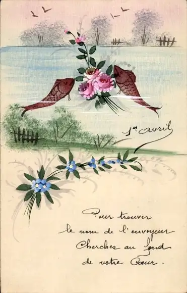 Ak Glückwunsch 1. April, Fische, Rosen, Teich