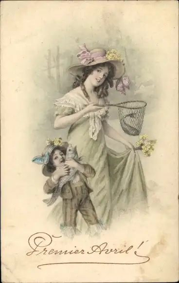 Ak Glückwunsch 1. April, Frau mit Kind, Fische