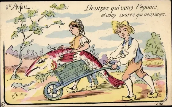 Ak Glückwunsch 1. April, Kinder, Schubkarre, Fisch