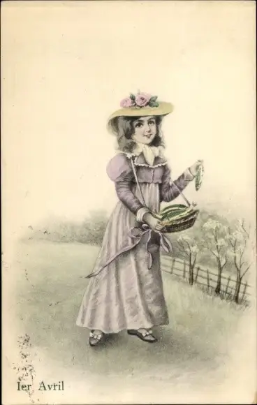 Ak Glückwunsch 1. April, Mädchen, Korb, Fische