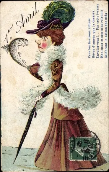 Ak Glückwunsch 1. April, Noble Frau, Fisch, Hut mit Federn