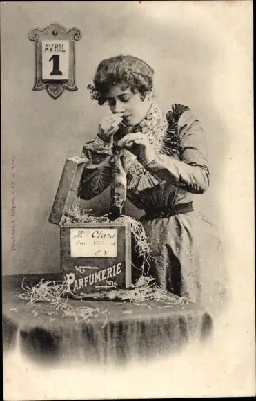 Ak Glückwunsch 1. April, Parfumerie, Frau mit Fisch, Kalender