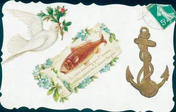Ak Glückwunsch 1. April, Taube, Fisch, Vergissmeinnicht, Rose, Anker