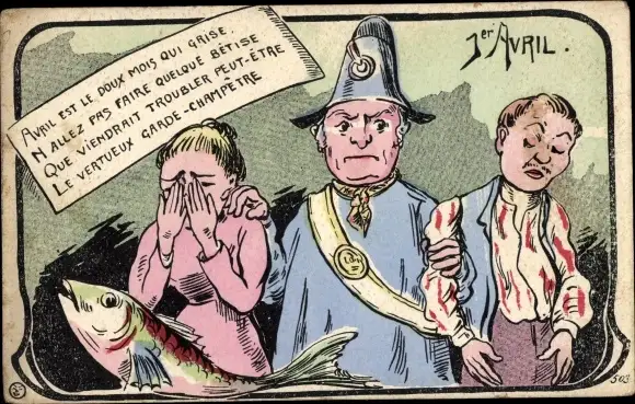 Ak Glückwunsch 1. April, Weinende Frau, Polizist, Fisch